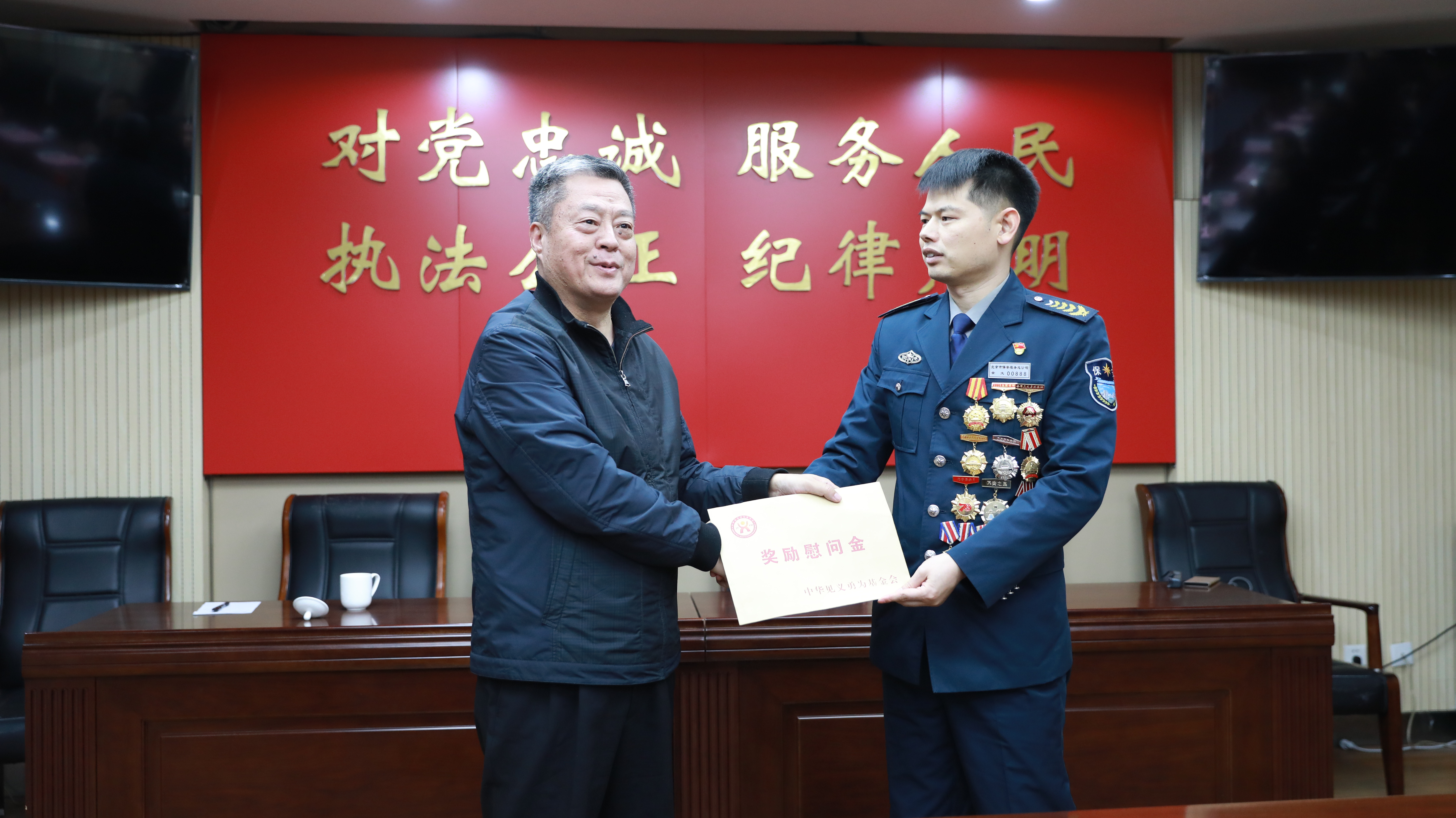 胡增印秘书长为姜顺玉送上慰问金,他表示,此次受中华见义勇为基金会邓卫平理事长委托,代表中华见义勇为基金会到北京市慰问姜顺玉同志,对他当年的见义勇为行为及近年来的发展给予褒扬、鼓励和肯定。姜顺玉同志获得全国见义勇为英雄模范表彰,不骄傲、不自满,爱岗敬业,无私奉献,尤其在新冠疫情管控一线,勇于冲锋在前,并火线入党,为首都的和谐稳定做出了突出贡献。他所取得的荣誉不仅是个人优良品德体现,也是北京市保安服务总公司社会责任的充分展示。希望姜顺玉同志,再接再厉、再立新功,以激励更多人民群众扶正扬善、见义勇为。希望北京市各级党委、政府进一步关心关爱见义勇为人员工作生活,为他们排忧解难,切实保障他们的合法权益,让见义勇为人员有幸福感、荣誉感和获得感,大力弘扬正气,匡扶正义,努力营造见义勇为社会氛围,形成见义勇为、见义众为新时代首都社会新风尚。